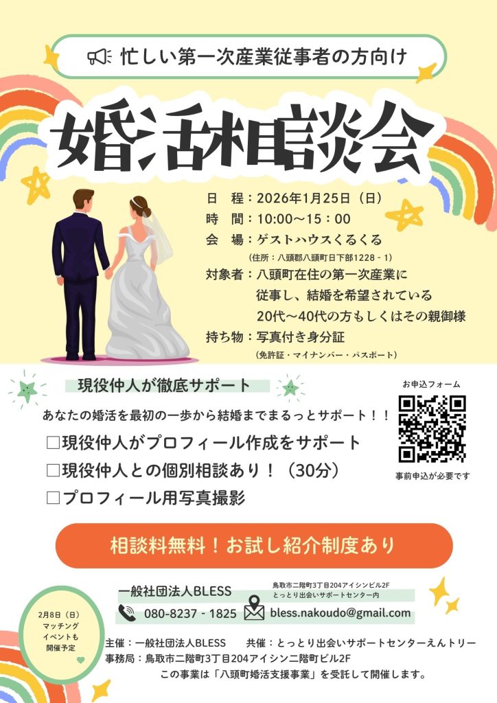 この度、八頭町の第一次産業に従事されている方を対象とした、無料の婚活相談会を開催します。